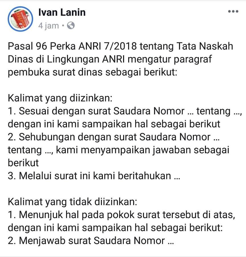 Unsur, Jenis, Syarat, dan Contoh Surat Dinas - Materiku from 1.bp.blogspot.com Karena termasuk salah satu jenis surat resmi, surat resign juga harus dituliskan berdasarkan kaidah yang telah ditentukan. Berikut ini adalah beberapa contoh surat pengumuman resmi yang biasanya digunakan oleh masyarakat di indonesia. Masuk ke format pembuka, disini anda bisa melihat ada beberapa baris kalimat pembuka sebelum menjelaskan inti surat. Dalam penulisan surat resmi , salam pembuka adalah salah satu komponen yang harus ada. Pada bagian ini kalimat pembuka berfungsi untuk pengantar pembaca sebelum masuk pada inti pembahasan. Kalimat yang tepat untuk melengkapi penggalan surat di atas ini adalah. Kota dan tanggal pembuatan surat. Dengan mempelajari kalimat pembuka dan penutup dalam presentasi, kamu bisa memiliki kepercayaan diri dalam memulai suatu.