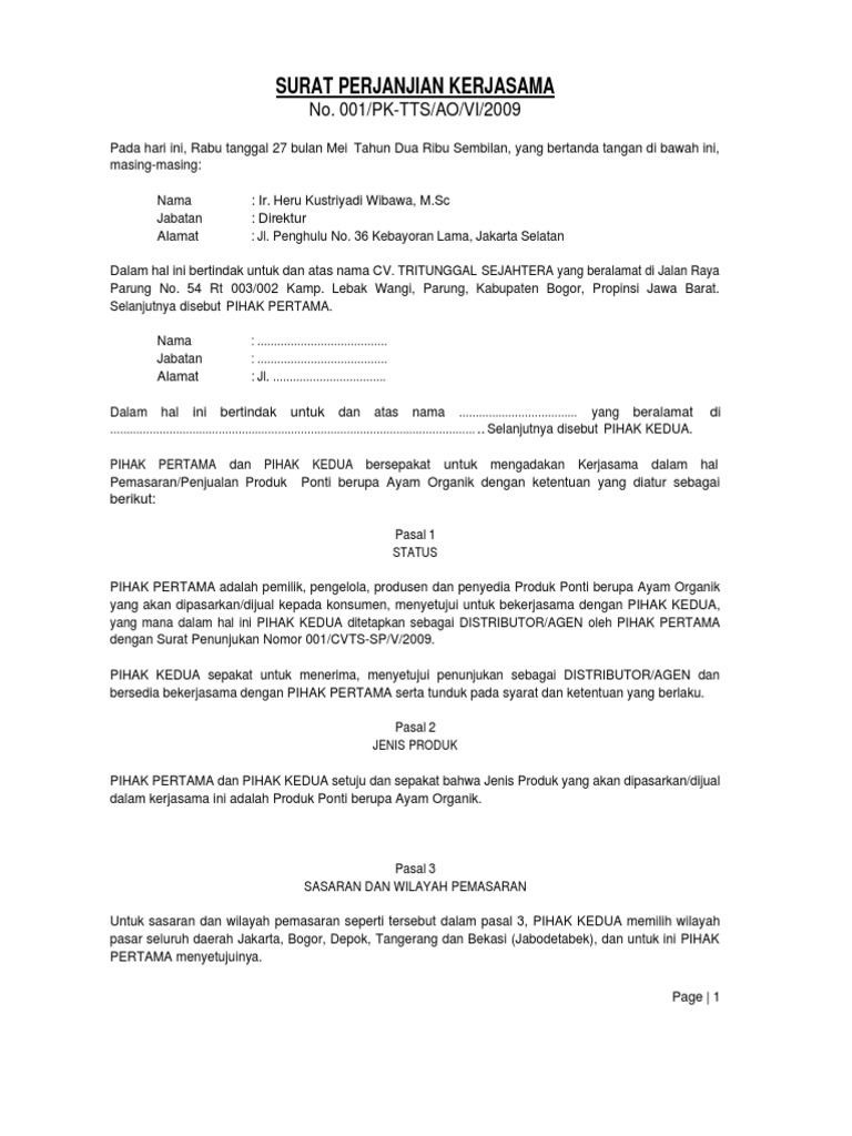 Selain itu, dibuat menggunakan format yang baik dan benar. Kedua belah pihak telah bermufakat untuk mengadakan ikatan perjanjian kerjasama penggaduhan ayam potong, dengan syarat dan ketentuan yang diatur dalam 12 (dua belas) pasal, sebagai berikut Akan tetapi tidak semua anda bisa jadikan contoh yang baik maka dari itu telah melakukan perjanjian kerjasama usaha dengan kesepakan sebagai berikut: Kerjasama tersebut bisa dilakukan oleh dua orang atau dua pihak, bahkan juga lebih. Melihat dari manfaat dan isi surat perjanjian kerja sama usaha di atas, kita tentu sudah dapat menggambarkan poin apa saja yang harus dimasukkan dalam surat perjanjian kerjsa sama usaha.